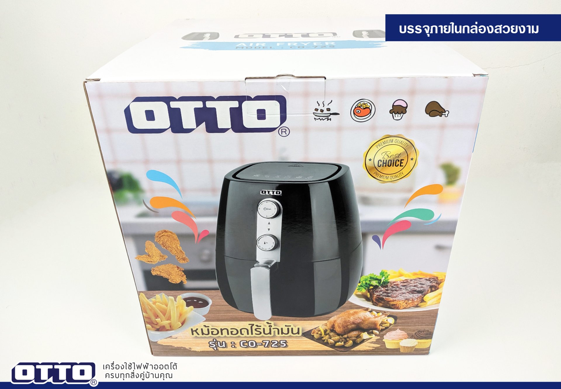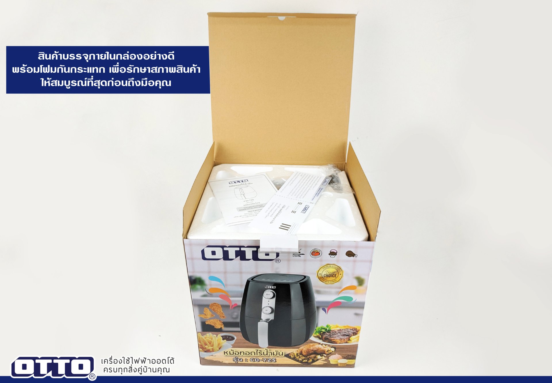 หม้อทอดไร้น้ำมัน รุ่น CO – 725 บรรจุมาในกล่องสีสันสวยงาม ด้านในมีแผ่นโฟมป้องกันความเสียหายจากการกระแทกช่วยให้ลูกค้ามั่นใจได้ว่าของที่ถึงมือจะอยู่ในสภาพที่สมบูรณ์ที่สุด