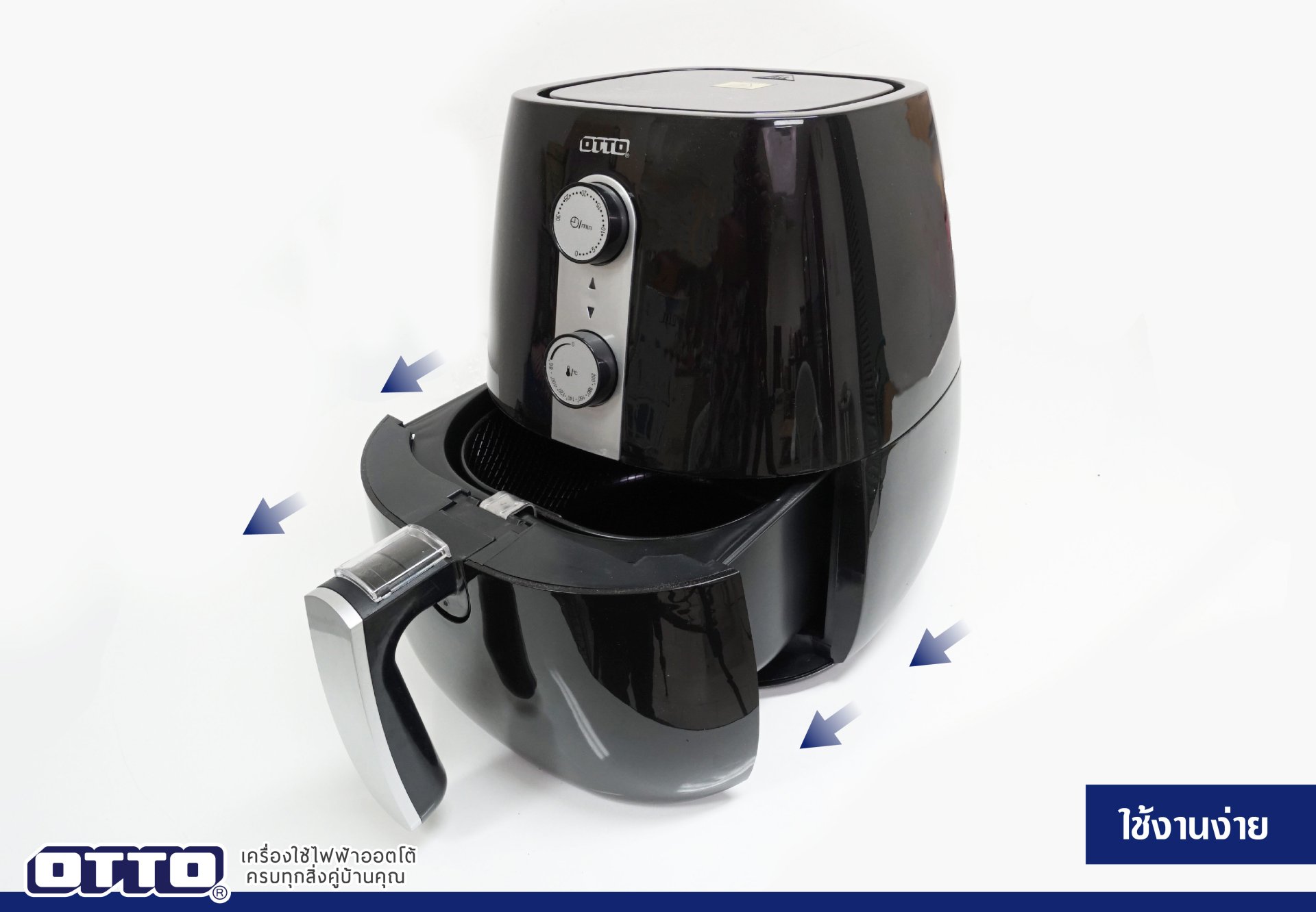 การใช้งานหม้อทอดไร้น้ำมันก็ง่ายดายเพียงดึงถาดทอดออกจากตัวเครื่อง หมุนลูกบิดความร้อนตามที่ต้องการกับเวลาที่จะใช้เครื่องจะทำงานโดยอัตโนมัติ